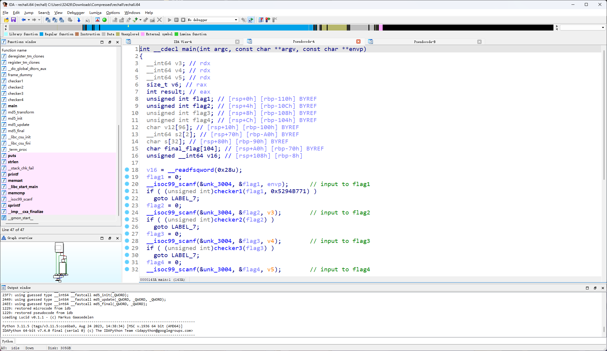 4.透过观察发现要输入的四个数字都通过checker1-4的检查才能拿到flag,并且输入的数字转换成16进制拼在一起就是flag。