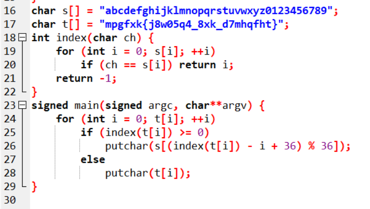 观察密码表 table = 'a~z' + '0~9',能看出来这个密码是一个简单的替代密码。观察前面 mpgfxk 和 moectf 的关系,发现 m=m,p、o 是相邻的,g、e 是隔着一个的,自然可以得到根据位置决定变换的变种凯撒密码。