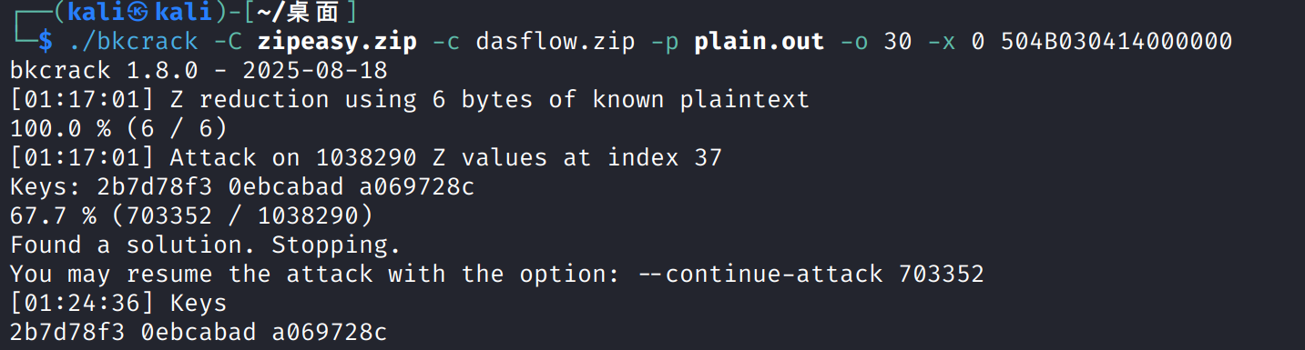 ./bkcrack -C zipeasy.zip -c dasflow.zip -p plain.out -o 30 -x 0 504B030414000000echo -n "dasflow.pcapng" > plain.out爆破时间有点漫长,不要着急喵~