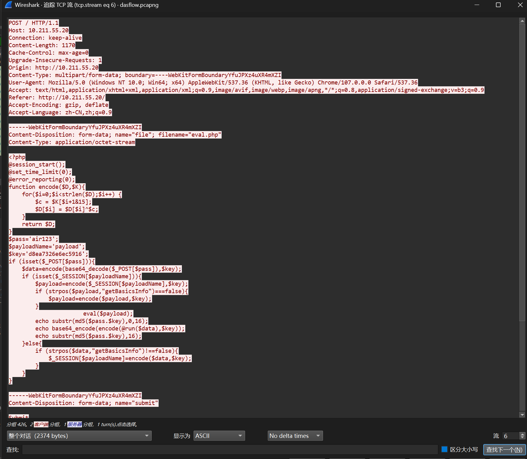 ./bkcrack -C zipeasy.zip -c dasflow.zip -k 2b7d78f3 0ebcabad a069728c -d dasflow.zip找到TCP流,发现有eval.php文件
